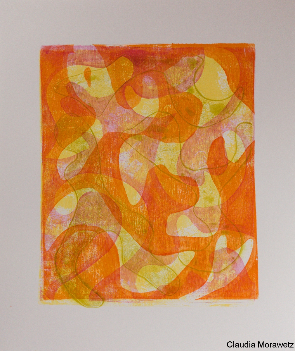 In 2015 I started experimenting with a variety of printing techniques, especially with techniques requiring no press. I wanted to create unique and painterly prints, improvising and playing with both form, color, and texture.